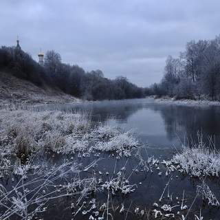 Яркое, практически алое, отражение восходящего солнца в тихой глади разлившейся воды на реке Шерна, во Владимирской области.