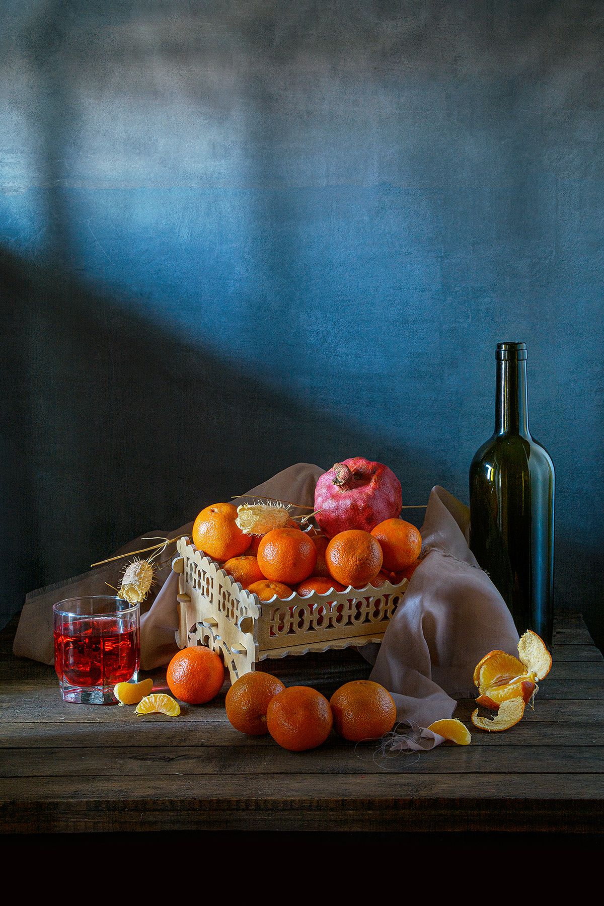 мандарины, гранат, бутылка, стакан, вино, конфетница, оранжевый, Алексей Бычков