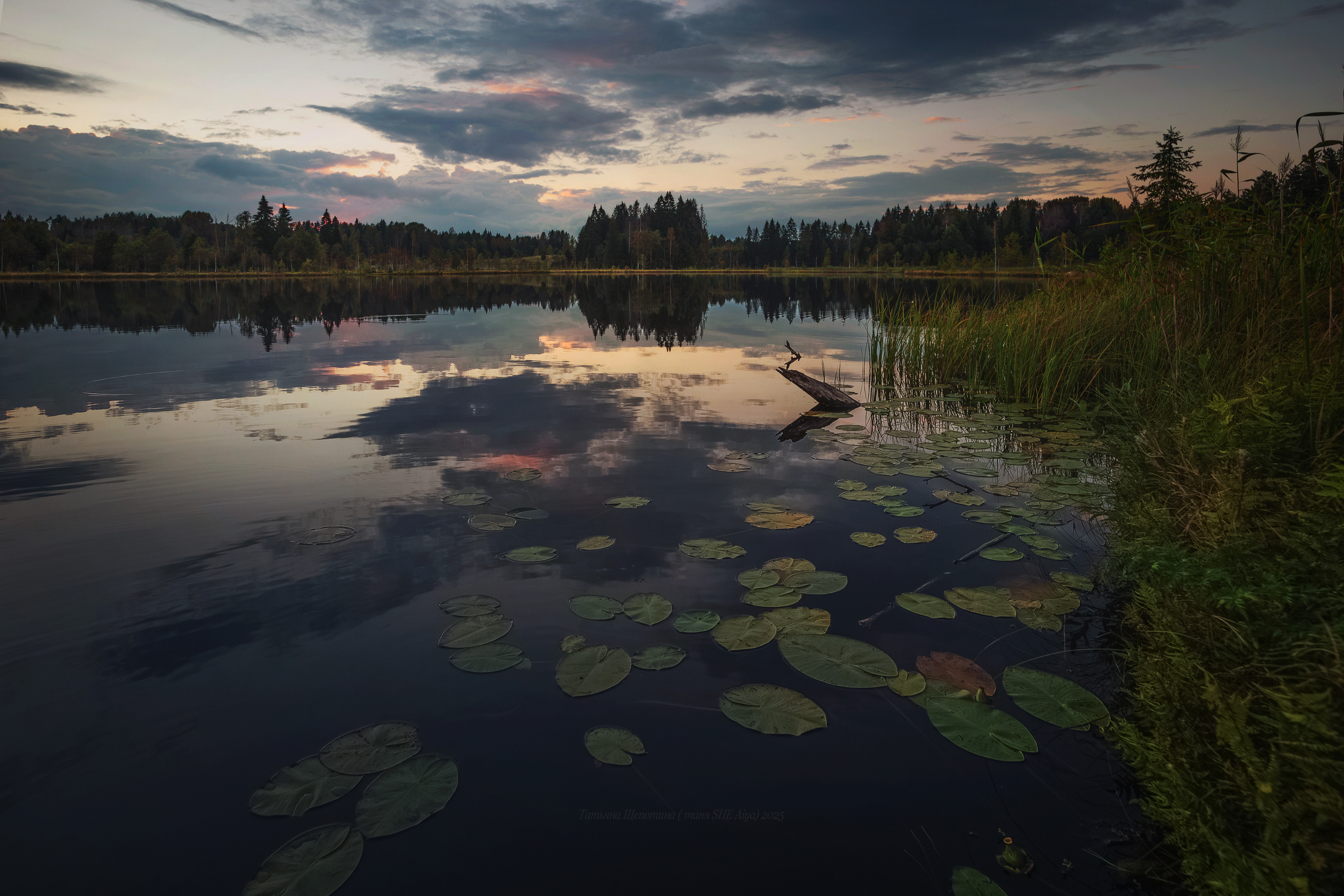 Вечер сентября.... Водичка великолепная. Вокруг озера болото с клюквой! Такой тёплый день. Клюкву собирали в купальниках, периодически купаясь в озере....А после сели на мосточки и любовались....