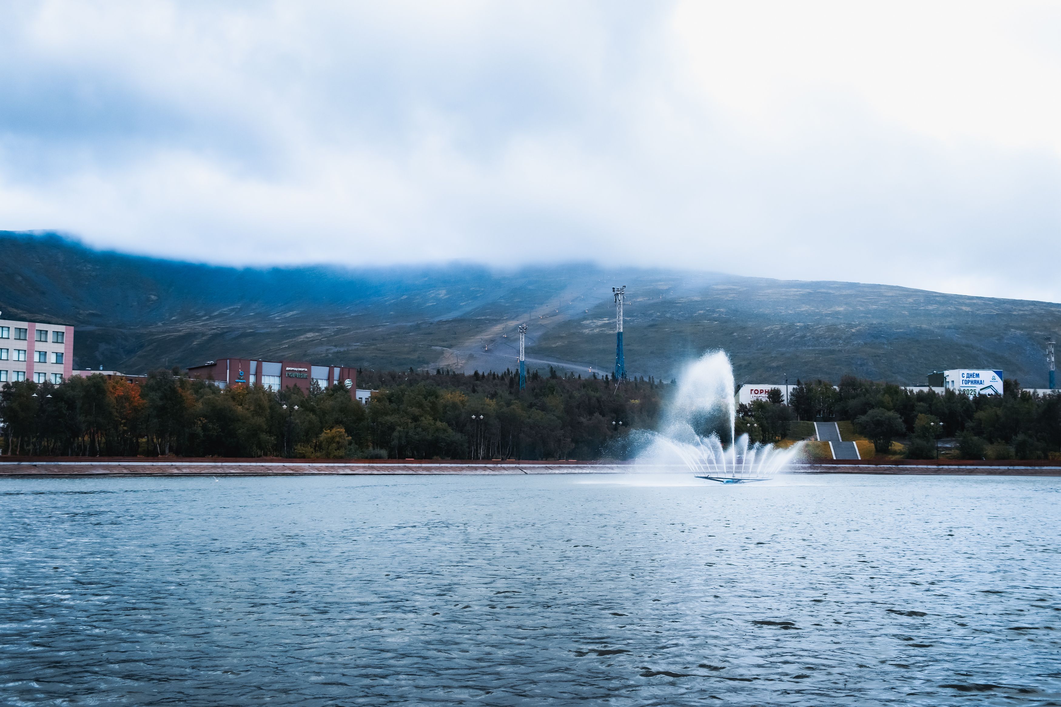 Фонтан на озере Верхнем в Кировске, Мурманская область