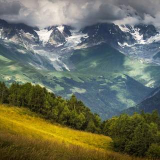 Слои гор сразу после заката и возвышающаяся над ними Шхара 5 203м, высочайшая точка Безенгийской стены, Кавказ, Грузия, 2025.