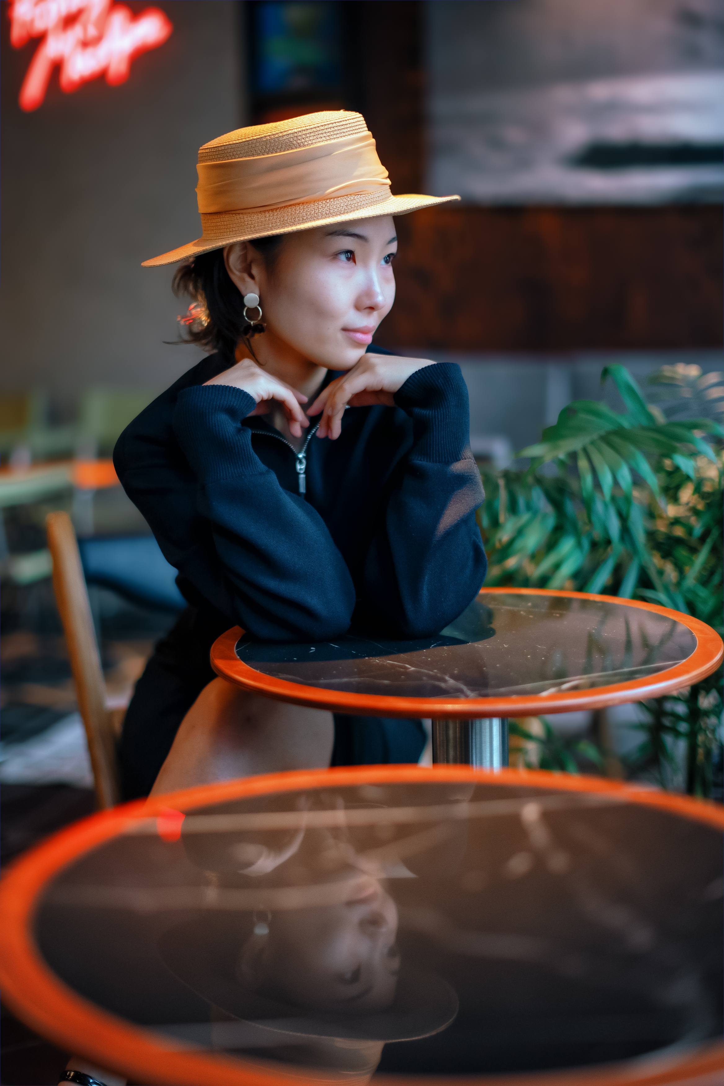 Очень красивая девушка в шляпке позирует за столиком в кафе