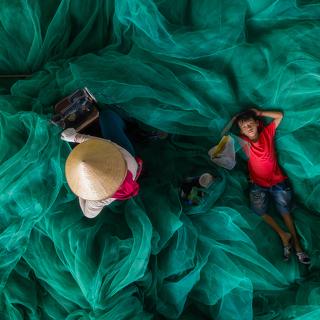 The women in this village started a working day in the early morning. They sew the fishnet after a fishing journey. They work 7 days a weeks, so in the Sunday, many kids came here with their mom.