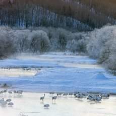 Морозное утро, река, журавли.